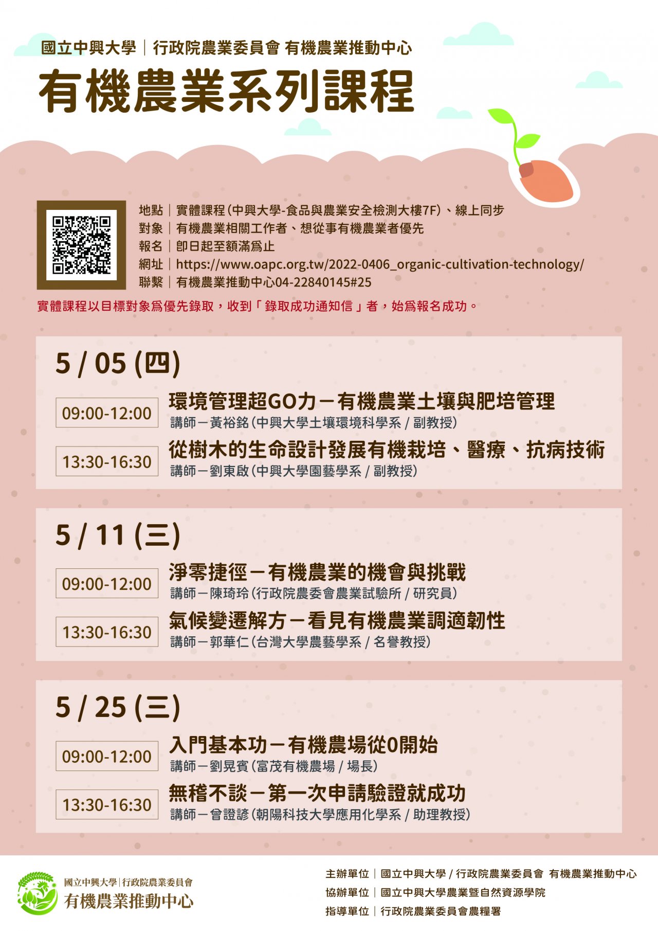二、 | 為促進有機農業發展及有機理念之交流,該校舉辦「2022 有機農業推動中心系列課程」,敬邀有機農業相關工作者及想從事有機農業者報名參與,增進有機農業的知識與交流。惠請公告課程相關訊息,並轉知相關人員報名參加。 |