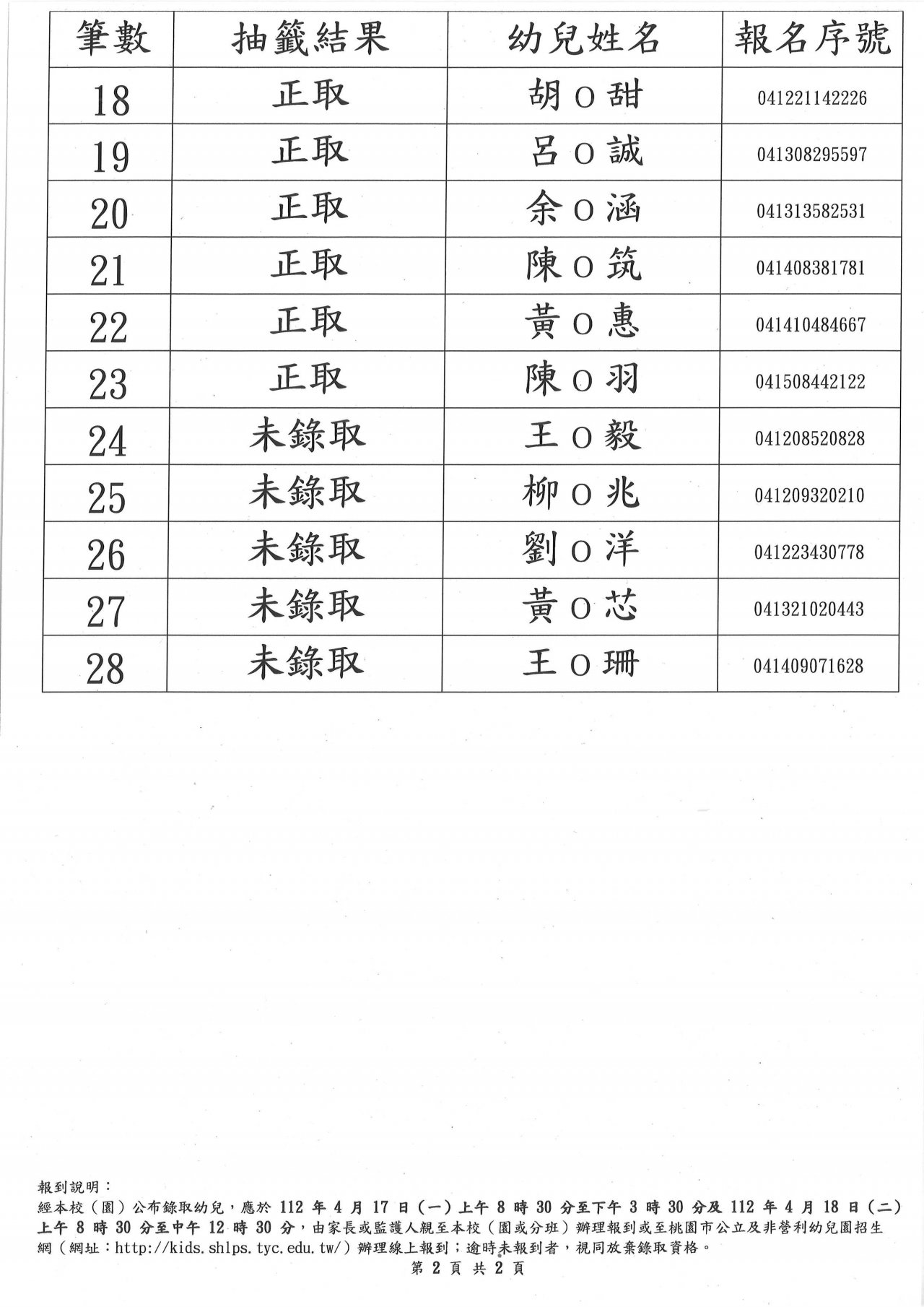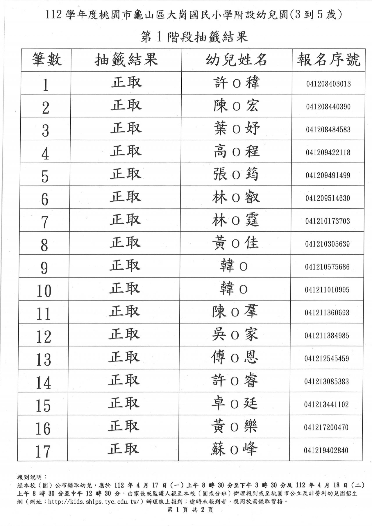 公告幼兒園 112 學年度第 1 階段新生入園抽籤結果