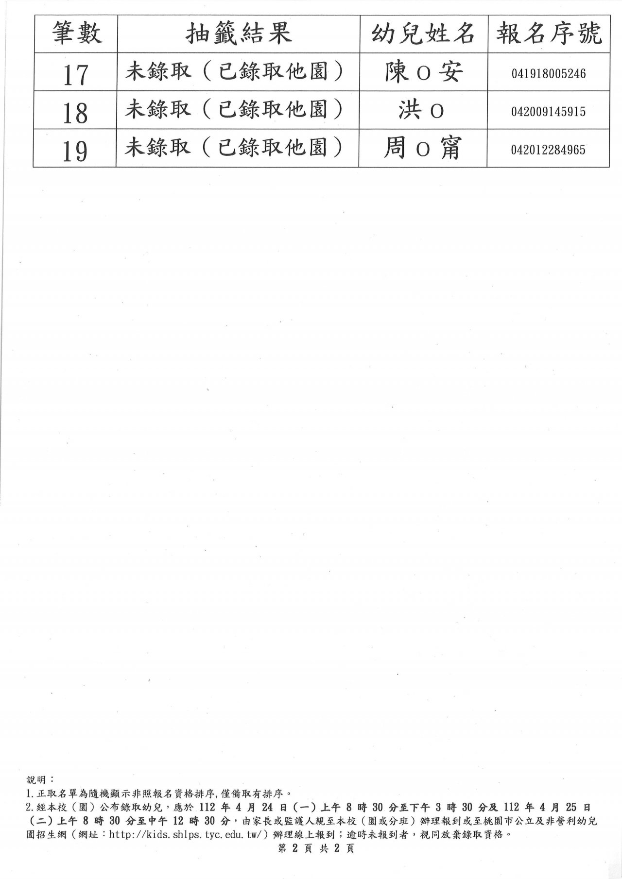 公告幼兒園 112 學年度第 2 階段新生入園抽籤結果