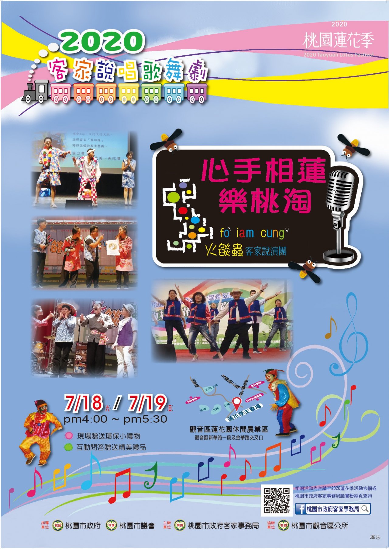 一、為將客家語言與文化以不同風貌呈現,強化客語推廣及親子共同參與,旨揭表演訂於 109 年 7 月 18 日(星期六)及 109 年 7 月 19 日(星期日)下午 4 時至 5 時 30 分假觀音區蓮花季活動會場(新華路一段及金華路交叉口)辦理,全程戶外演出免費自由入場,邀請貴校師生踴躍參加。