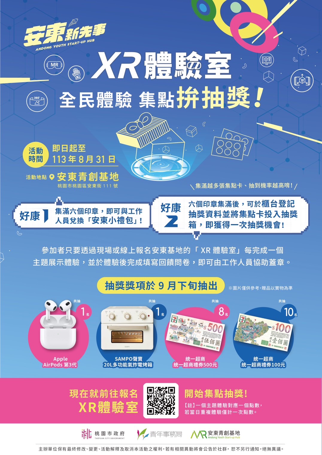 一、 | 本局所轄之安東青創基地以發展 XR 、元宇宙、區塊鏈、多媒體遊戲及數位影音內容應用相關產業領域為主題,並設有 XR 體驗館,本期教育及文化為主題,未來將不定期更新主題,並辦理不定期抽獎活動,敬邀貴校師生踴躍參與,期待體驗展能增加學生接觸 XR 領域的技術及應用。 |