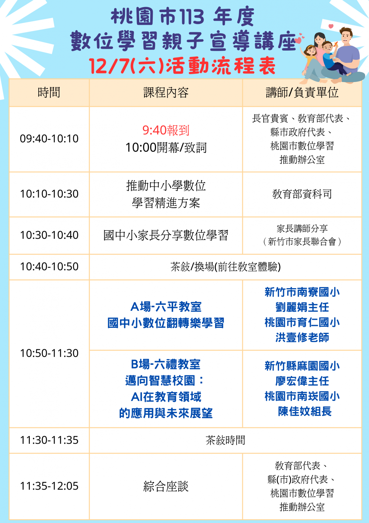 | 二、 | 為提升家長及教師對於數位學習的認識及了解,特邀請專家學者進行宣講及體驗活動。 |