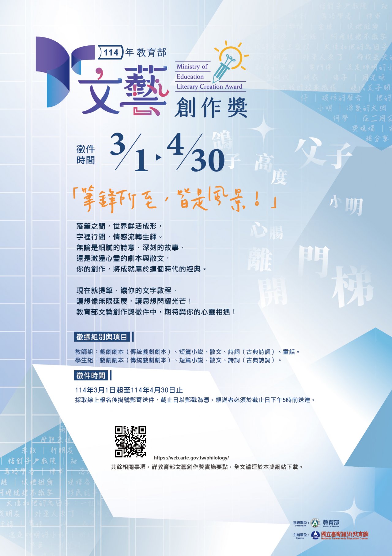五、 | 受理期間為自 114 年 3 月 1 日(星期六)起至 114 年 4 月 30 日(星期三)截止,採取先線上報名(網址: https://web.arte.gov.tw/philology/)後掛號郵寄送件方式辦理。 |