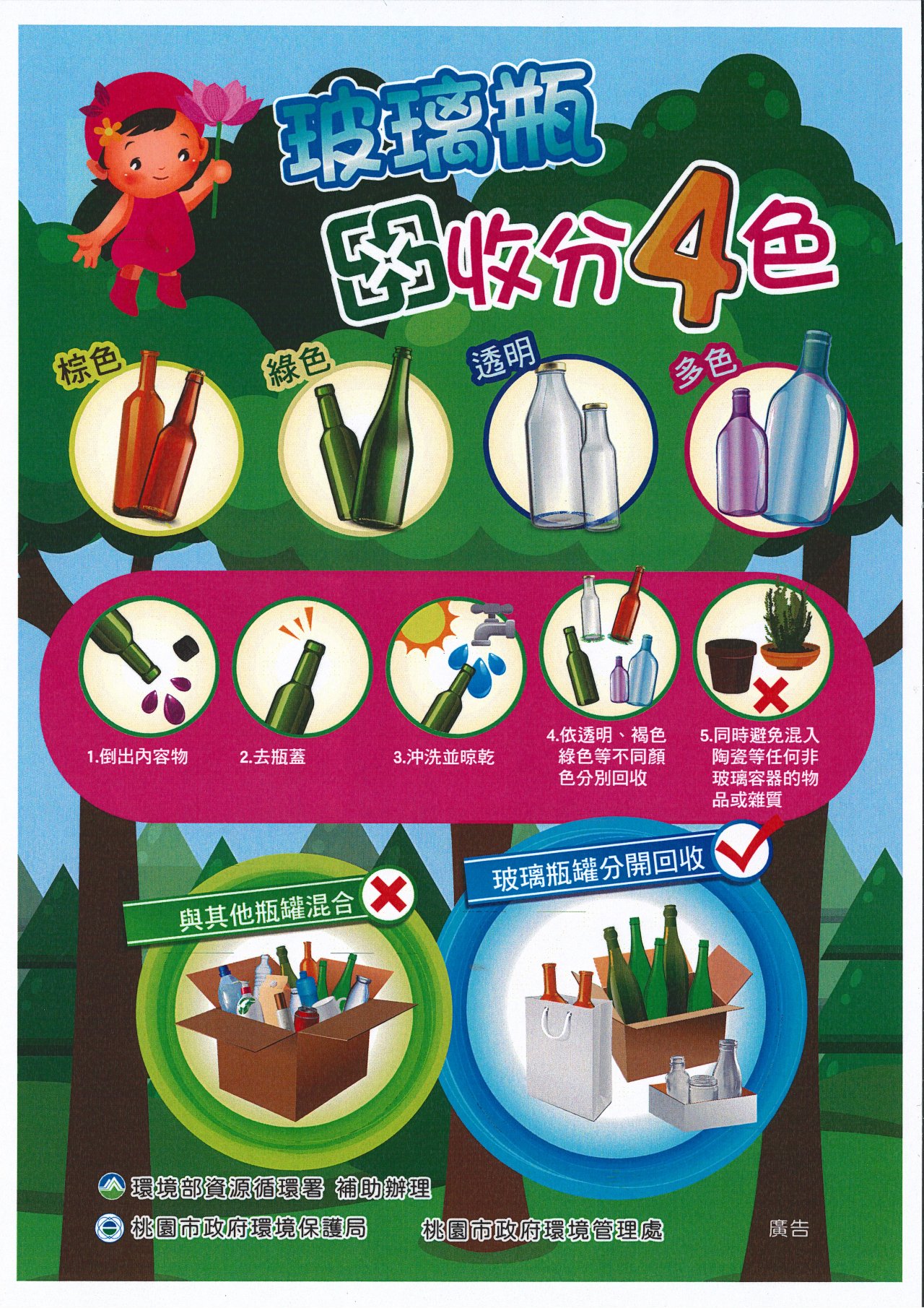為利後端回收處理作業,玻璃瓶分四種顏色回收,以利提高 回收再生品質,請貴校惠予協助宣導玻璃瓶回收之注意事 項。