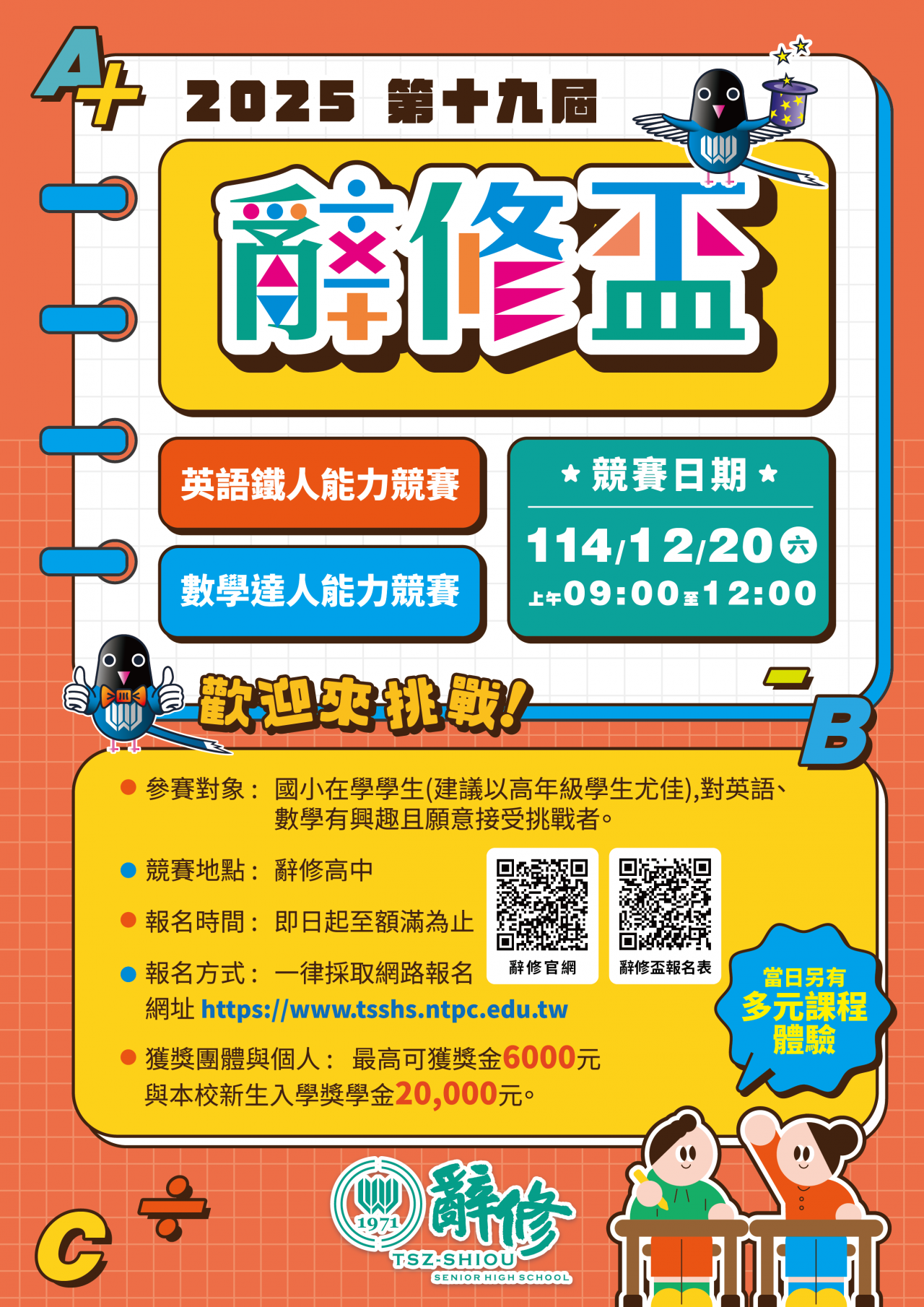 二、 | 競賽日期為 114 年 12 月 20 日(星期六)上午 9 時,於本校大禮堂舉行。報名一律採網路受理,並自即日起至 12 月 12 日(星期五) 13 時截止。因參賽名額有限,至額滿為止(報名網址 http ://http://www.tsshs.ntpc.edu.tw ,或掃瞄競賽辦法 QR code ),另錄取名單將以電子郵件、電話通知。 |