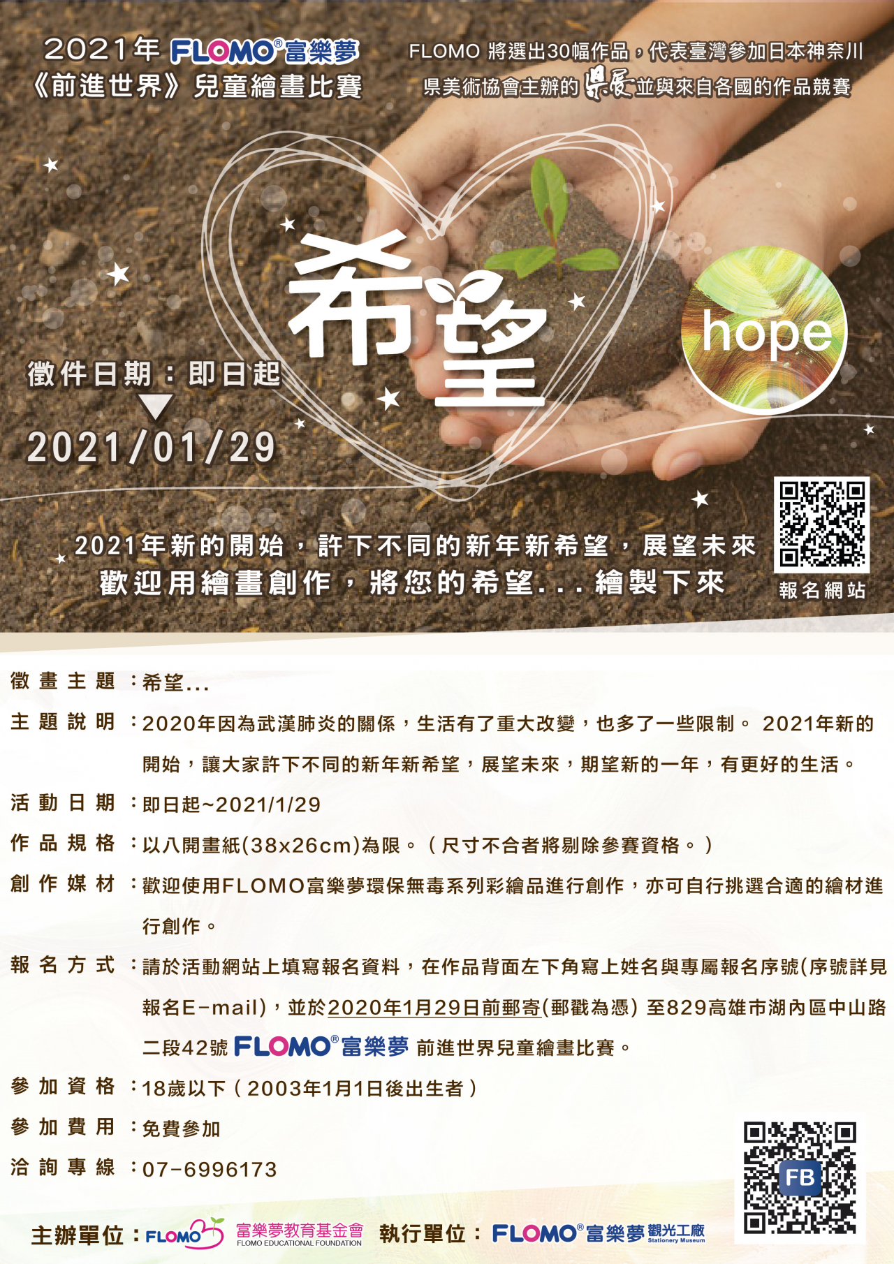 報名方式:請至活動網站上填寫報名資料,並在截止日前,將畫作寄到 829 高雄市湖內區中山路二段 42 號 FLOMO 富樂夢前進世界繪畫比賽。